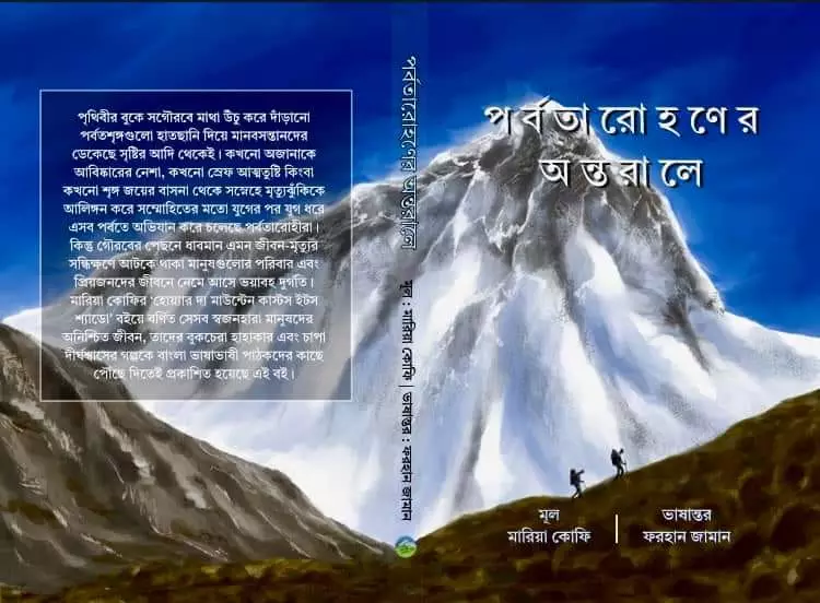 পর্বতারোহীদের অপ্রিয় এই প্রসঙ্গকে অবলম্বন করে এই বইয়ের অবতারণা করেছেন মারিয়া কোফি। কিংবদন্তি ব্রিটিশ পর্বতারোহী জো টাস্কারের এই প্রেমিকা হিমশীতল পর্বতে হারিয়েছেন নিজের ভালোবাসার মানুষকে। সান্ত্বনাহীন সেই শোকের সাথে যুঝতে যুঝতেই হাতে তুলে নিয়েছেন কলম, লিখেছেন ‘Where The Mountain Casts Its Shadow: The Dark Side of Extreme Adventure’। এরই অবলম্বনে ‘পর্বতারোহণের অন্তরালে’ শিরোনামে বাংলায় বইটি অনুবাদ করেছেন পর্বতারোহী ফরহান জামান। বইটি পড়তে গিয়ে ‘যে-আঁধার আলোর অধিক’-নামক শব্দগুচ্ছের সাথে আক্ষরিক অর্থেই পরিচয় ঘটবে বাংলা ভাষাভাষী পাঠকদের!